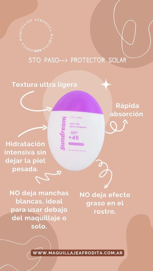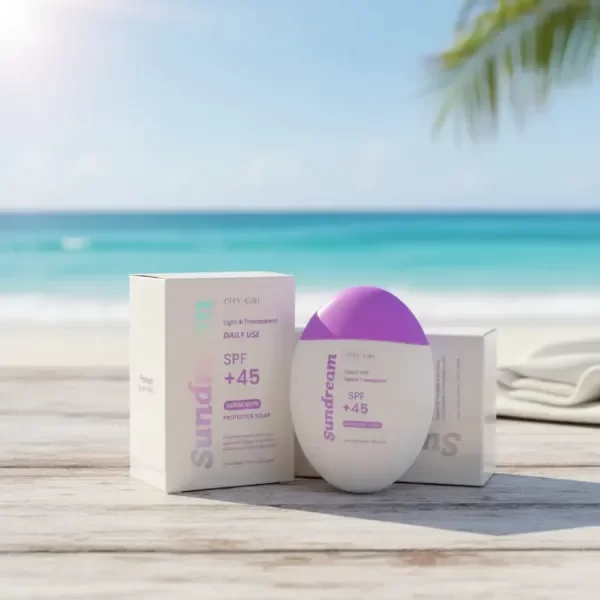 Protección Solar Efectiva El protector solar City Girl Sundream ofrece una protección diaria contra los rayos UV con un factor de protección solar (SPF) 45, ideal para el uso cotidiano. Fórmula Ligera y Transparente Su fórmula es ligera y transparente, lo que permite una aplicación cómoda y sin dejar residuos visibles en la piel. Uso Recomendado Perfecto para proteger la piel del rostro y cuerpo durante la exposición al sol diaria. Se recomienda aplicar generosamente antes de la exposición solar y renovar la aplicación cada dos horas o después de nadar o sudar. Presentación Envase práctico de 50 ml, fácil de llevar y usar en cualquier momento del día.